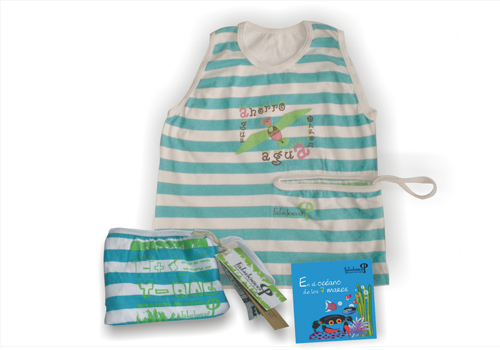 FABULOSICO® propone sorpresa en productos T-BAG®: remeras que se transforman para componer su propia bolsa de empaque y a la vez son contenedoras de un libro de 13 x 13 cm. Se trata de una fabula inédita, “En el océano de los 7 mares”. Trata la historia del cangrejo Barroso, que se encontraba enterrado en su pozo, porque había sido invadido por el petróleo. Una serie de personajes marinos intervienen para cumplir con la moraleja más importante, cuidar el agua. Una fábula en donde podrán encontrar rimas divertidas e ilustraciones coloridas, con una impresión en papel con certificación FSC.