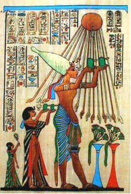 La máxima relajación del estilo llegó en forma de revolución religiosa, el faraón Amenofis IV renunció a su nombre por el de Akhenaton, a sus dioses por Aton (primer caso de monoteísmo), y a la estructura social preestablecida en contra de sacerdotes y funcionariado. Feo, enfermo, renunció a la representación conceptual que embellece el cuerpo humano, para aparecer en su realidad corporal. Su esposa, Nefertiti, ha quedado por ese mismo realismo como la reina indiscutible de la belleza en la Antigüedad. El sucesor de Akhenaton fue Tuthankamon, casi adolescente al subir al trono, casado con una niña. Reinó 18 meses, los sacerdotes envenenaron a él y a su esposa. Luego reinó la dinastía de Ramsés, en la cual se produjo el esplendor del arte colosal, con las pirámides y las enormes composiciones pictóricas. Imperio en decadencia: Egipto sufrió sucesivas invasiones de sus enemigos tradicionales: asirios, persas y Alejandro Magno (emperador de la Grecia Helenística).